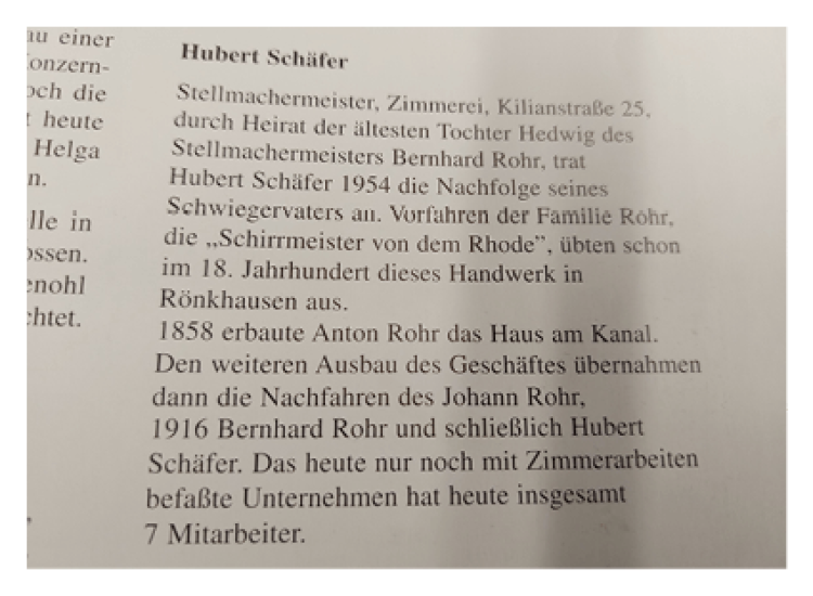 Im Jahr 1856 erbaute Anton Rohr in Rönkhausen am „Kanal“ (heute: Kilianstraße) ein Wohnhaus und eröffnete im gleichen Jahr dort eine Stellmacherei. (Stellmacher Bedeutungen: Handwerker, der hölzerne Bauteile für Fahrzeuge, zum Beispiel Kutschen herstellt). Den weiteren Ausbau des Betriebes übernahm dann sein Sohn Johann Rohr, so dass sich im Laufe der Jahre das Leistungsangebot des Betriebes um Holzarbeiten aller Art erweiterte.